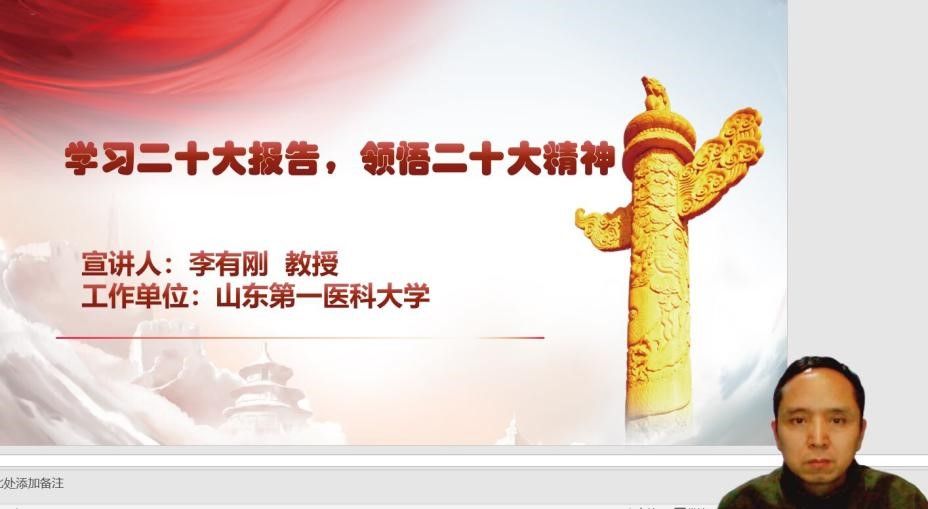 2022年11月25日19时,宣讲活动正式开始。PP电子游戏网站李有刚教授、博士(省属高校党的二十大精神宣讲团成员、学校党的二十大精神宣讲团成员、泰安市社会科学专家)做了题为“学习党的二十大报告,领悟党的二十大精神”的专题报告。李教授从大会主题、报告结构、伟大变革、理论创新、使命任务、具体工作等多个方面全面解读了党的二十大报告的主要内容,报告的最后结合山东省情讲述了十年来我省的变革与成绩,在新的起点展望了山东省的新征程。活动结束后,PP电子游戏网站党总支书记翟承强表示:“深入学习宣传贯彻党的二十大精神是PP电子游戏网站全体教师、全体党员在当前和今后一个时期的重要政治任务,广大教师党员要全面深入学习党的二十大报告,把党的二十大精神吃透拿准,摆正自己的政治站位,不断提升宣讲水平,以强烈的政治责任感和使命感投入到学习和贯彻党的二十大精神中去,努力为我校建设高水平大学贡献自己的力量”。