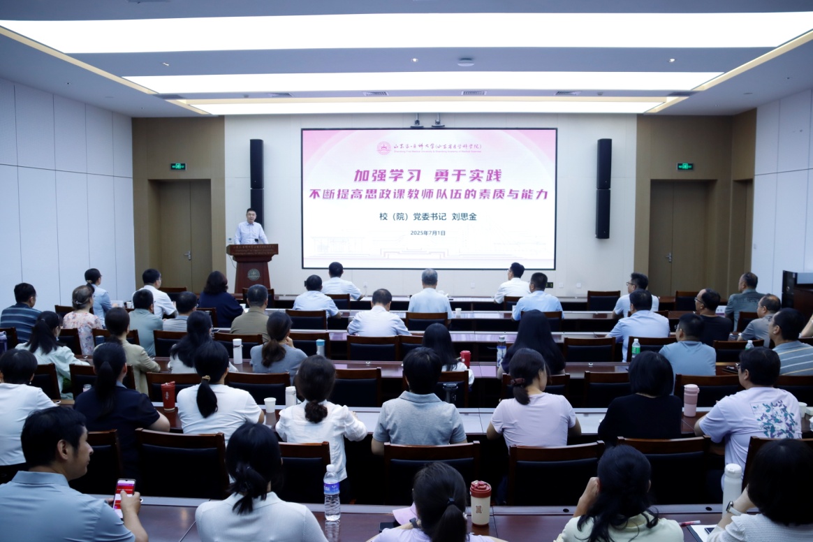 7月1日上午,校(院)2025年度思政课教师校级培训在济南校区举办,校(院)党委书记刘思金出席开班式,并以“加强学习、勇于实践,不断提高思政课教师队伍的素质与能力”为题,为全校思政课教师讲授专题党课。开班式由校(院)党委委员、副校(院)长贾海宁主持。