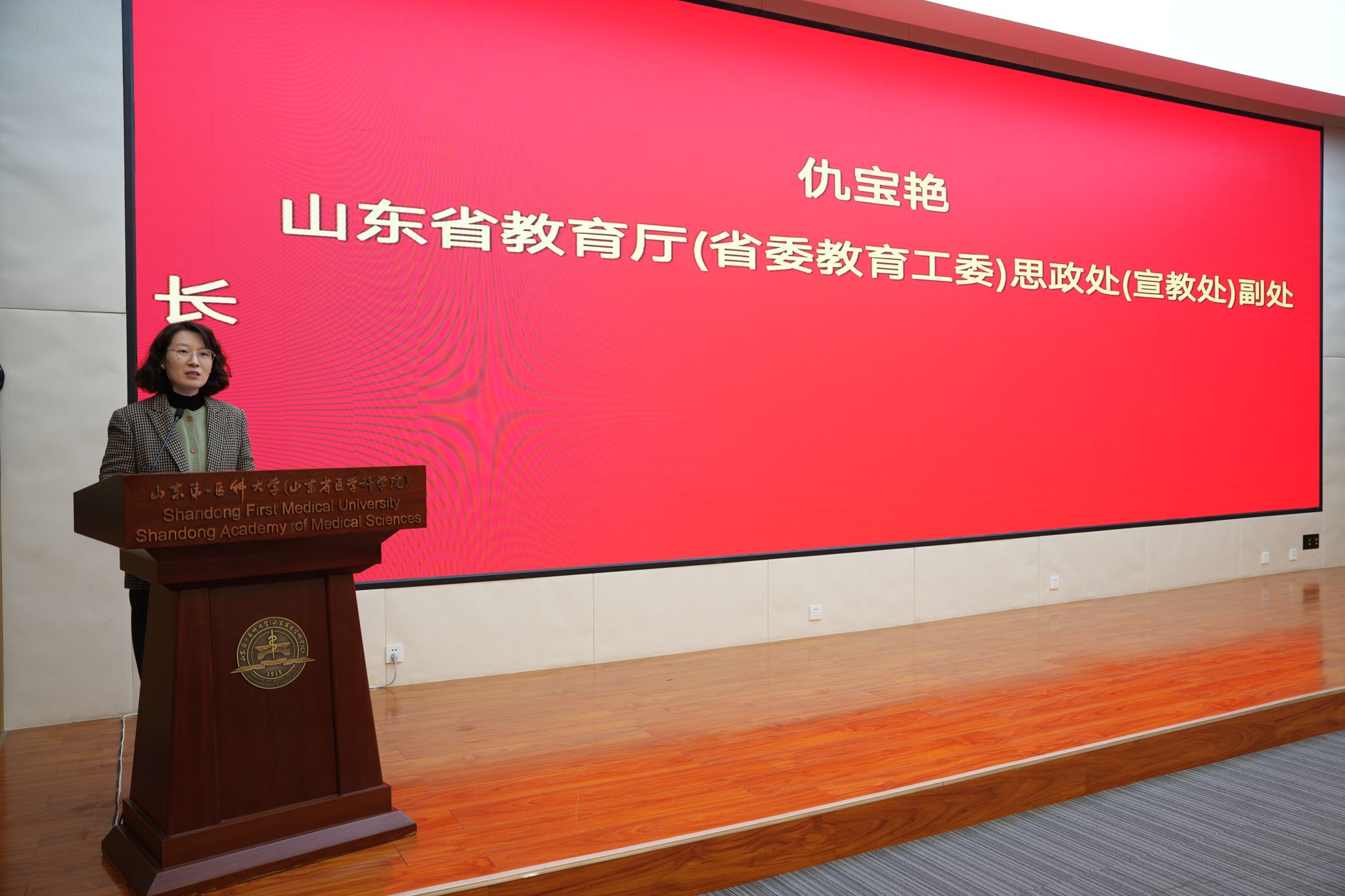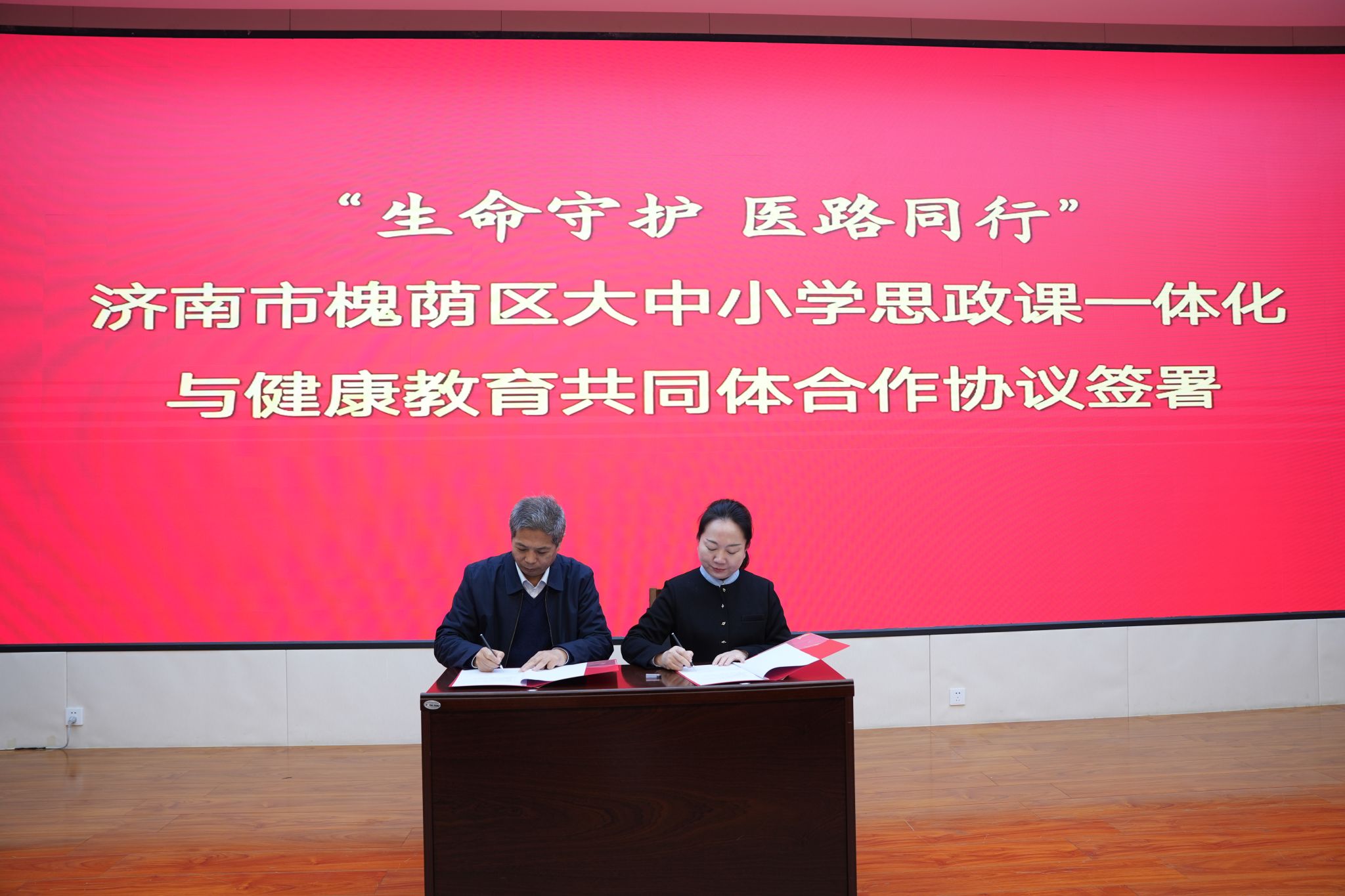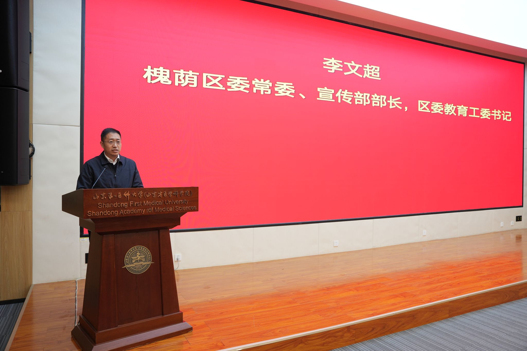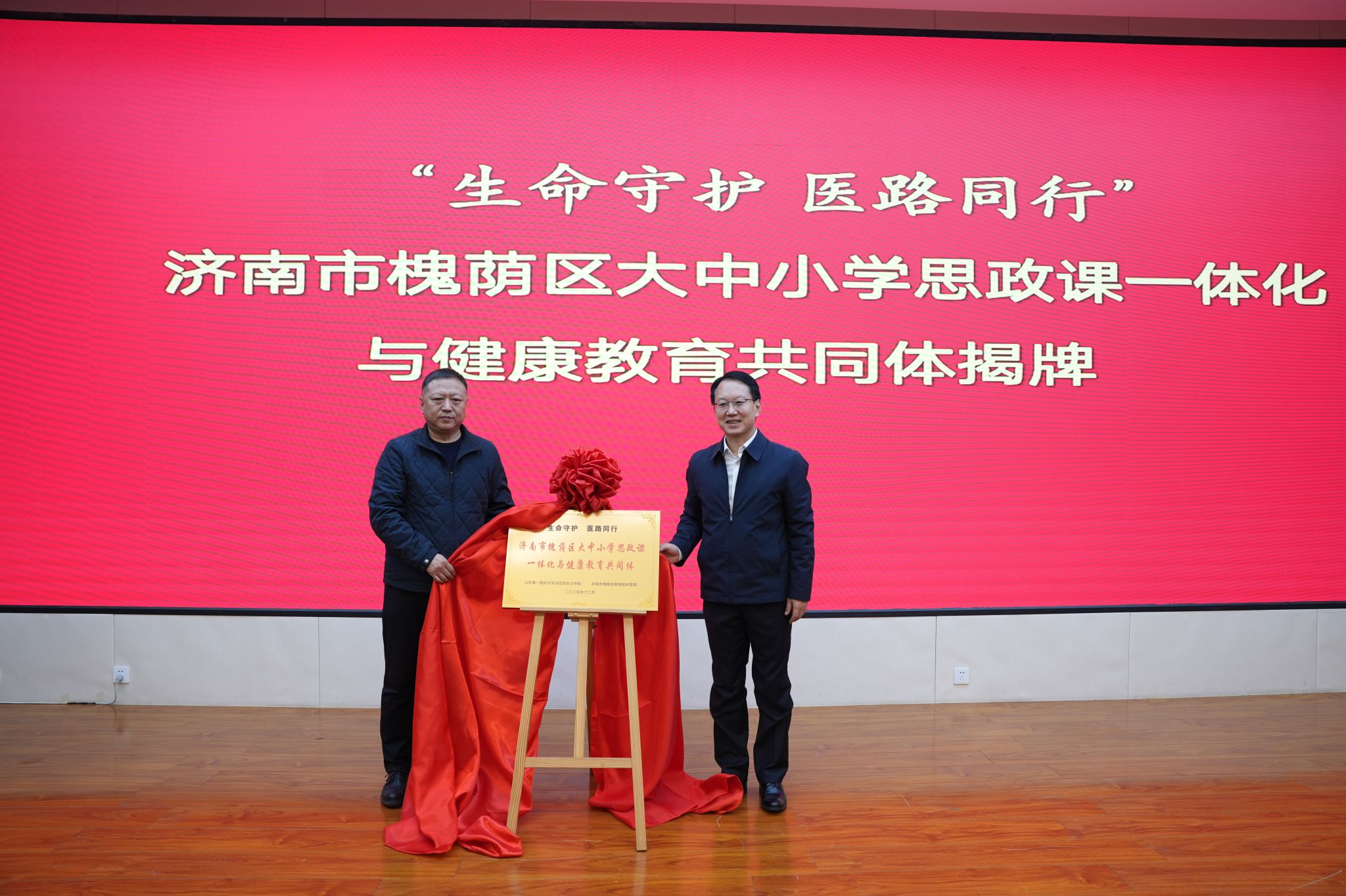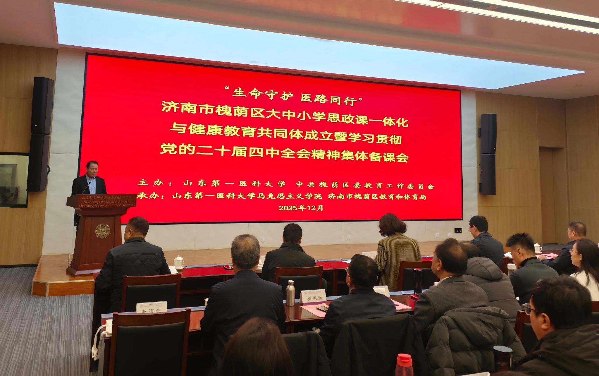 2025年12月16日上午,由学院和济南市槐荫区教育和体育局承办的,学习贯彻党的二十届四中全会精神集体备课会暨“生命守护 医路同行”槐荫区大中小学思政课一体化与健康教育共同体成立仪式,在PP电子游戏网站济南校区勤笃楼300会议室隆重举行。学校党委委员、副校(院)长贾海宁,槐荫区委常委、宣传部部长、教育工委书记李文超,山东省教育厅思政处副处长仇宝艳等出席成立仪式。
