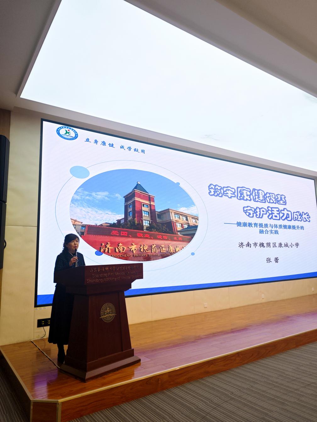 张蕾(济南市槐荫区康城小学党支部书记、校长)以《康健立身 活力成长——康城小学健康教育提质与体质健康提升的双轨实践》为题,阐述了学校“健康教育课程+体质健康促进”双轨并行的育人模式。