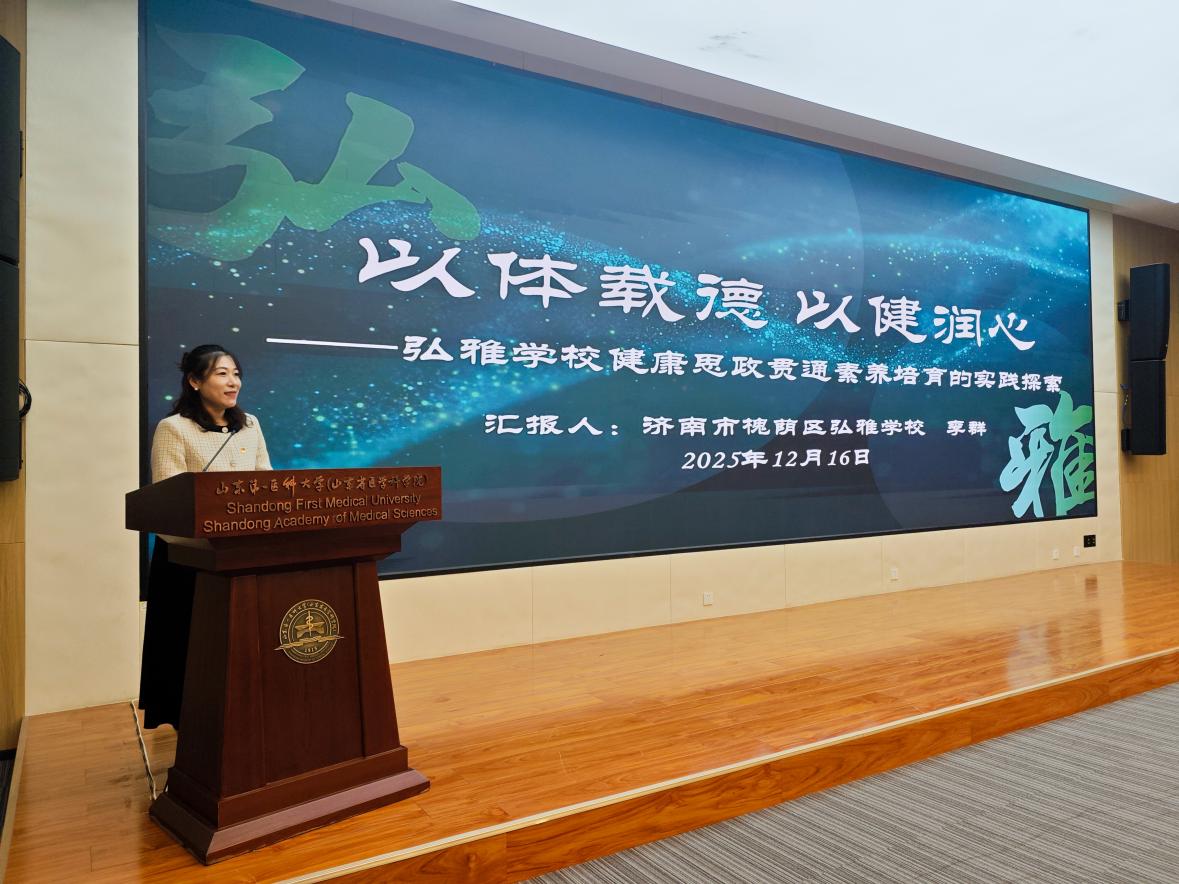 李群(济南市槐荫区弘雅学校副校长)在《以体载德 以健润心》发言中,阐述了体育教育在促进学生身心健康与品德养成中的重要作用。