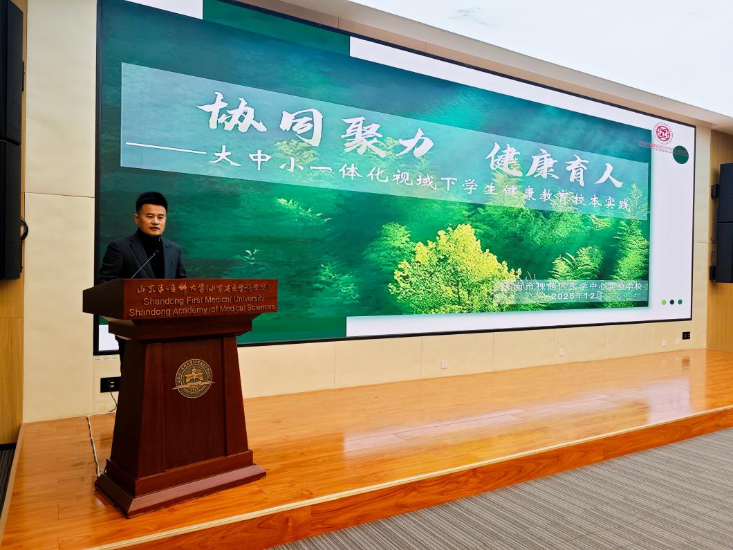 陈祥卫(济南市槐荫区医学中心实验学校副书记)以《用健康育人 以协同聚力》为题,介绍了学校开展医校融合、实践育人的具体做法。